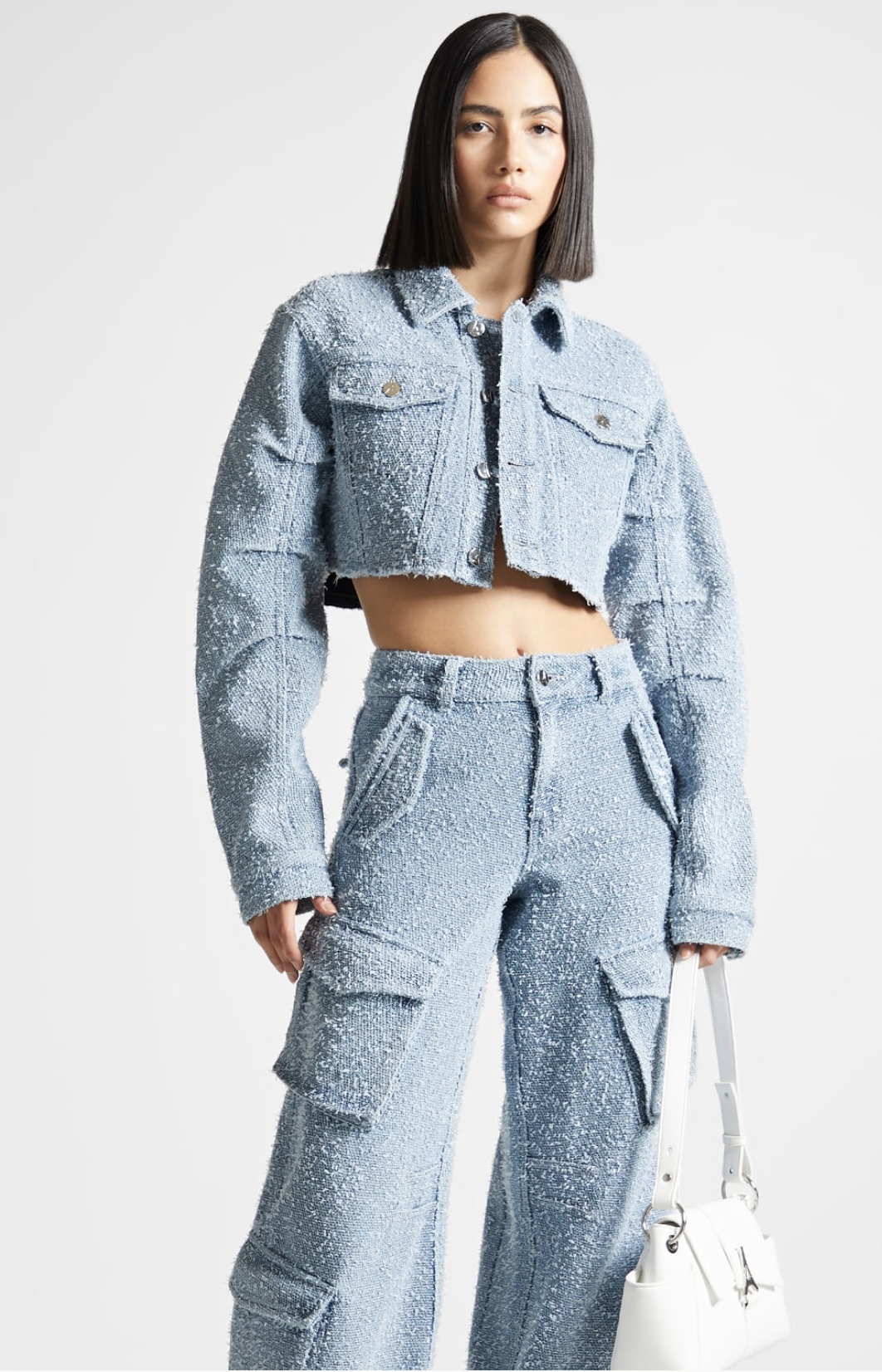 The Catherine Cropped Boucle Denim Jacket features a structured cropped silhouette in textured boucle denim. Finished with functional front pockets, tacking sleeves, silver hardware, and a vegan leather Manière De Voir patch, it balances modern style with everyday sophistication.