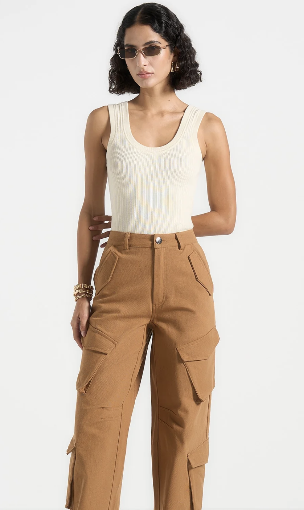 - High-waisted cargo pants silhouette for a structured, flattering fit