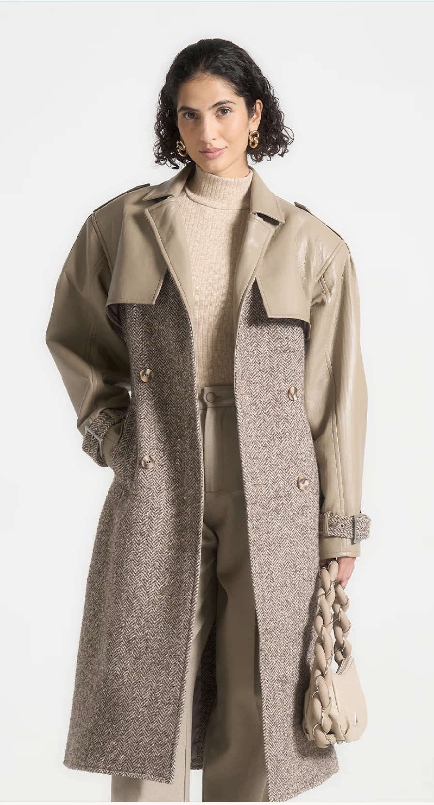 The Carina Herringbone & Leather Trench Coat combines timeless tailoring with modern contrast. Featuring herringbone wool and vegan leather panels, a bold storm flap, adjustable buckle belt, and tonal Manière De Voir patch, it delivers refined edge and effortless versatility.
