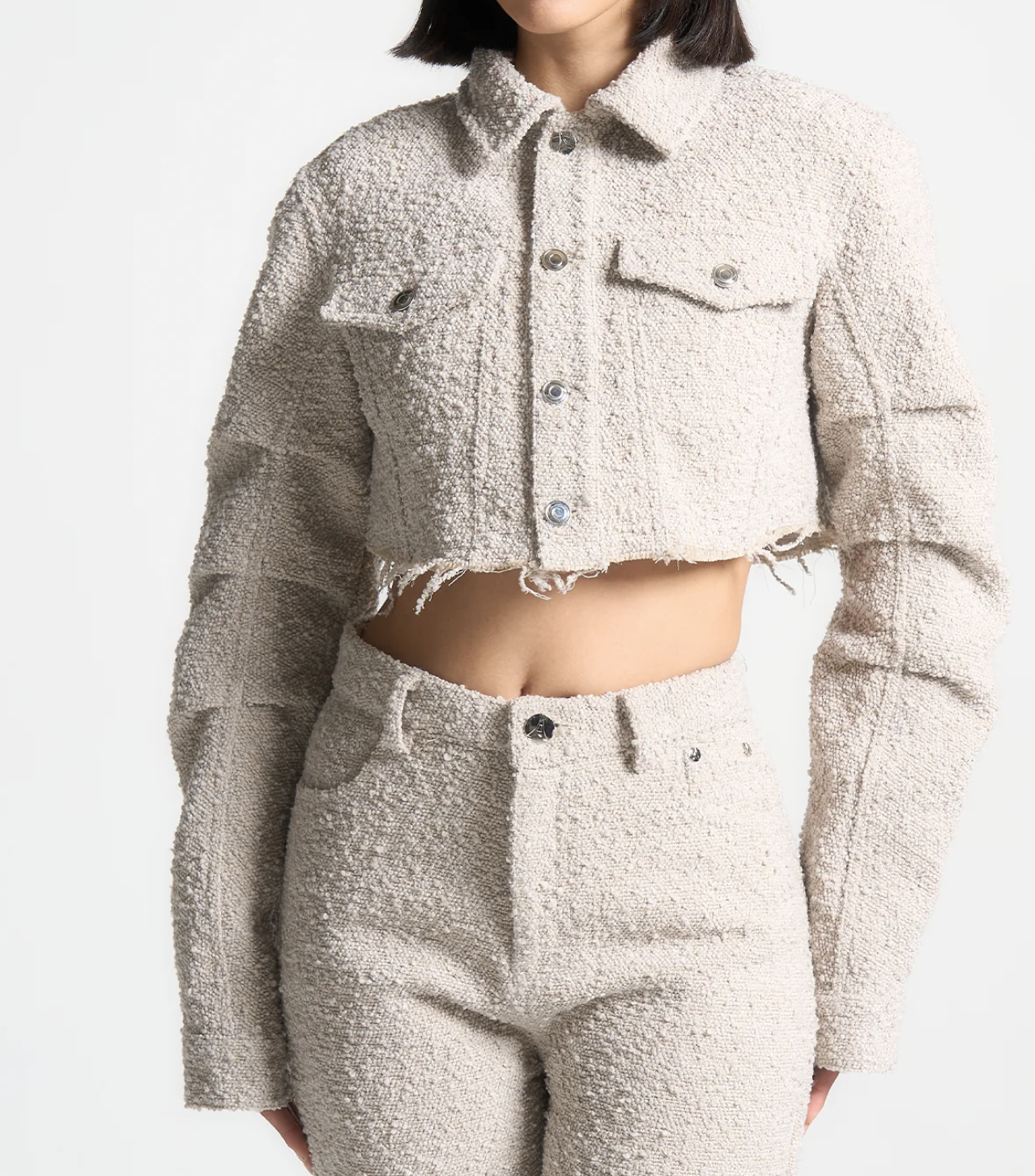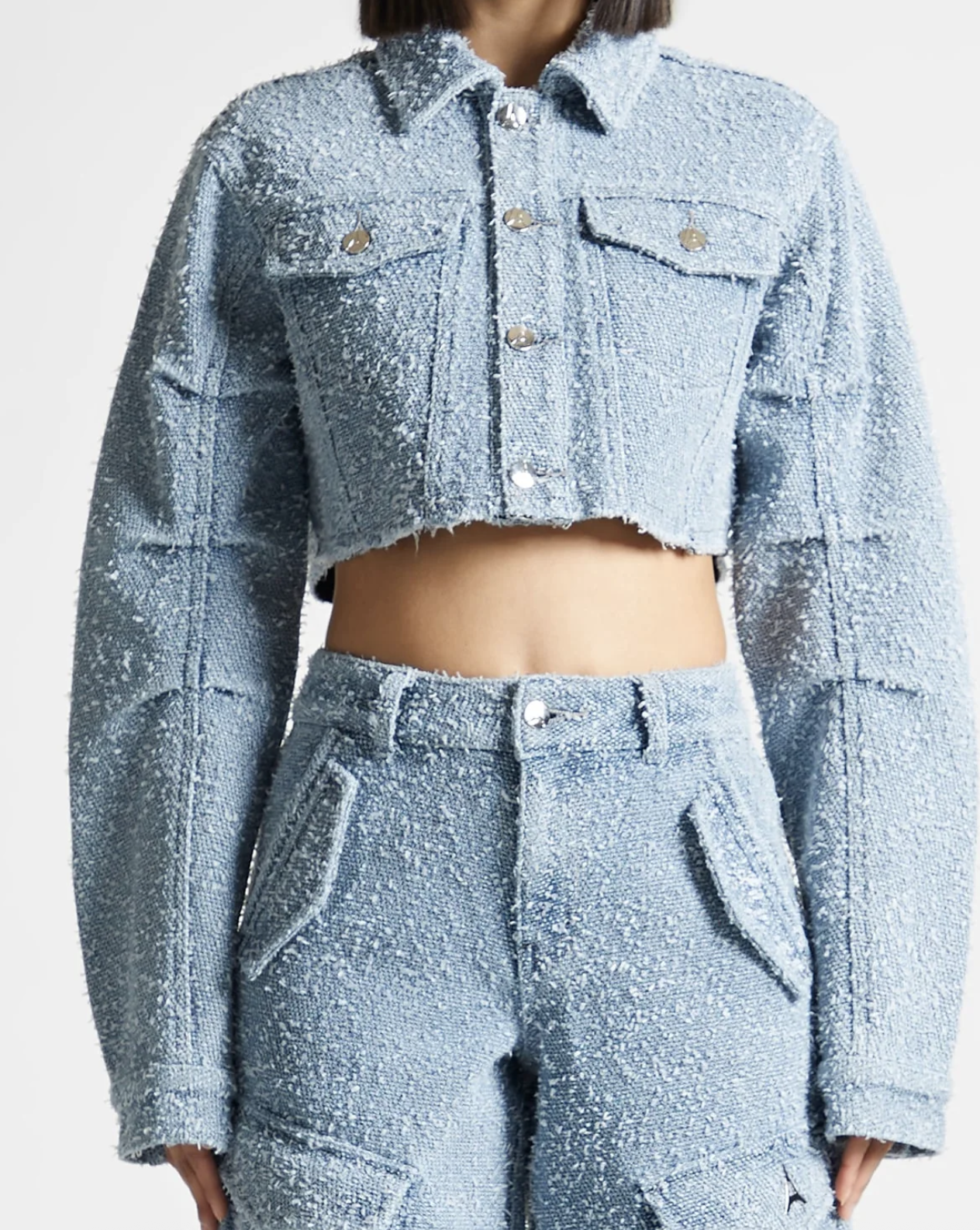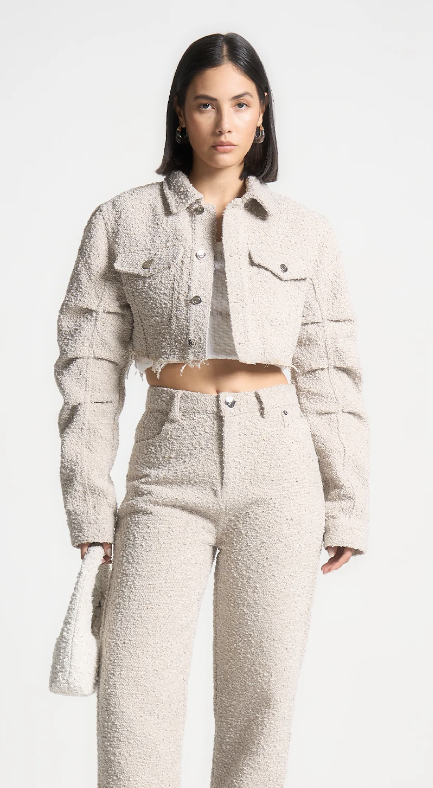 The Catherine Cropped Boucle Denim Jacket features a structured cropped silhouette in textured boucle denim. Finished with functional front pockets, tacking sleeves, silver hardware, and a vegan leather Manière De Voir patch, it balances modern style with everyday sophistication.