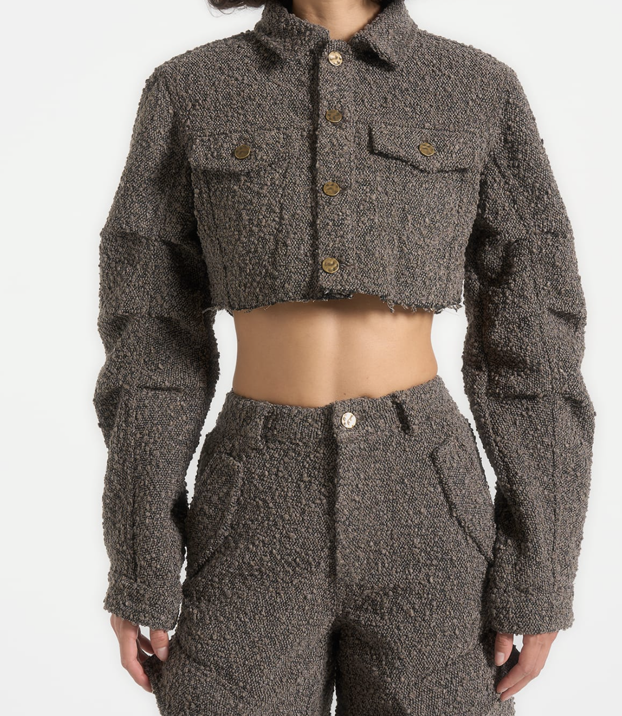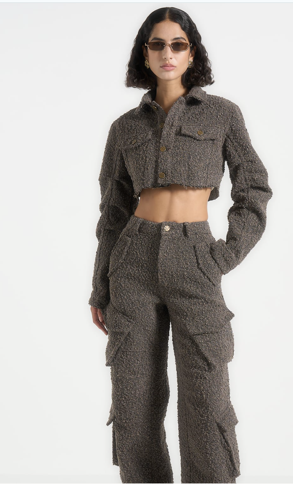 Pair with high-waisted trousers, skirts, or layered over dresses for a contemporary, elevated casual ensemble. The textured boucle fabric creates effortless dimension for both day and evening styling.