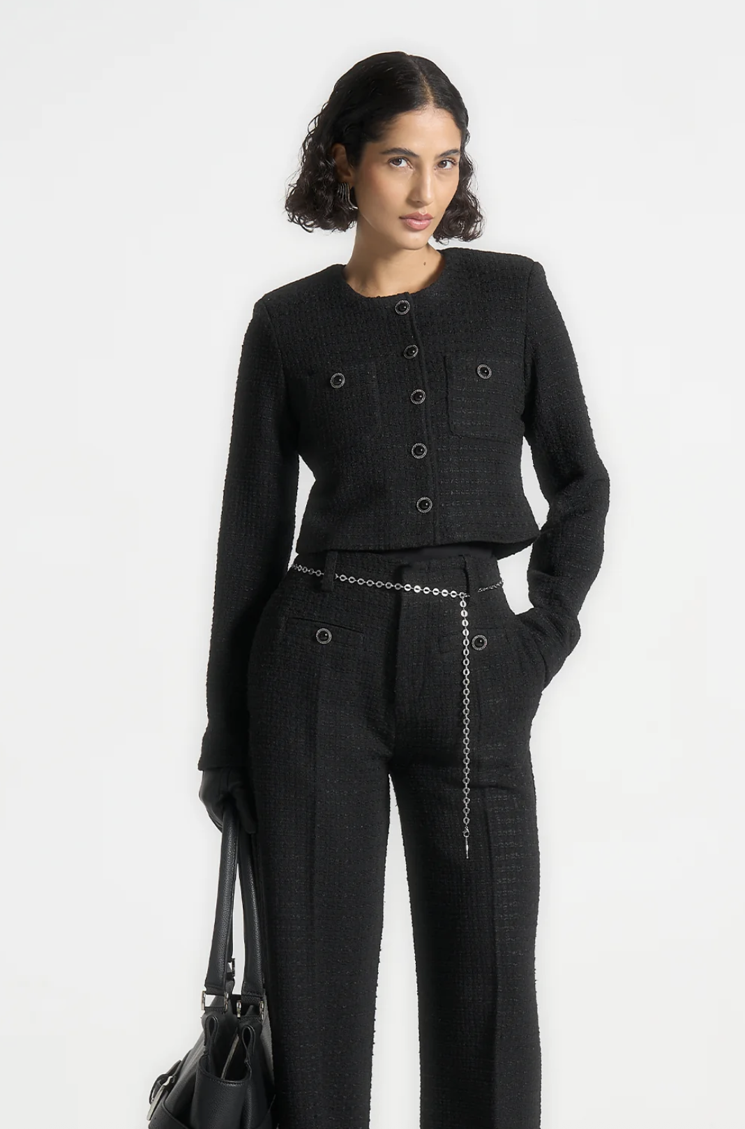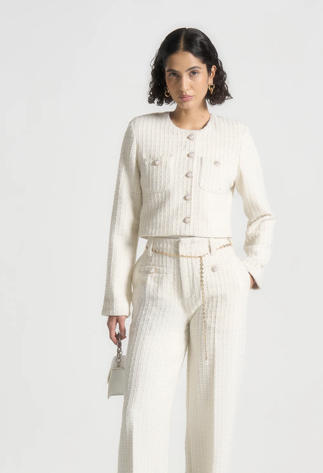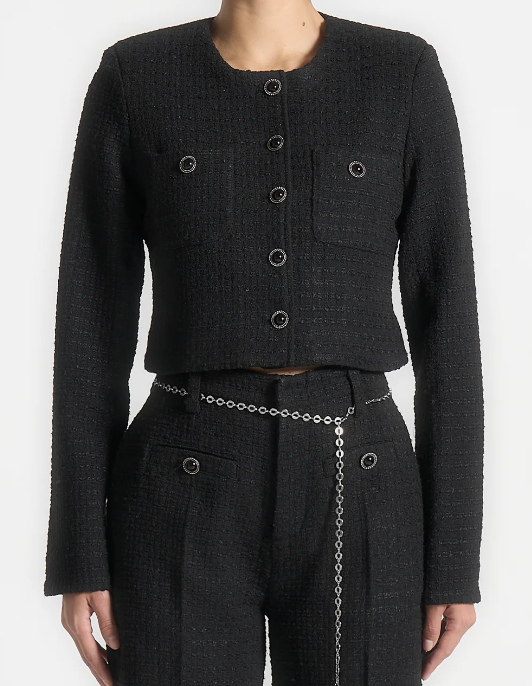 Crafted from premium tweed, the jacket is elevated with pearl button detailing, creating a sophisticated focal point that blends classic charm with modern refinement. Front pockets provide subtle utility, while the crew neckline and long sleeves maintain a clean, polished look.