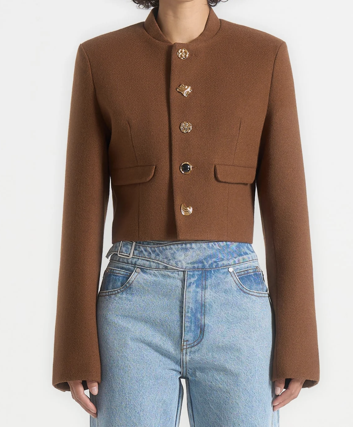 Gold statement buttons introduce a bold, polished accent, contrasting against the wool’s matte texture for an elevated visual interplay. Finished with gold Manière De Voir branding to the centre back, the Evana stands as a timeless outerwear piece that merges classic tailoring with contemporary edge.