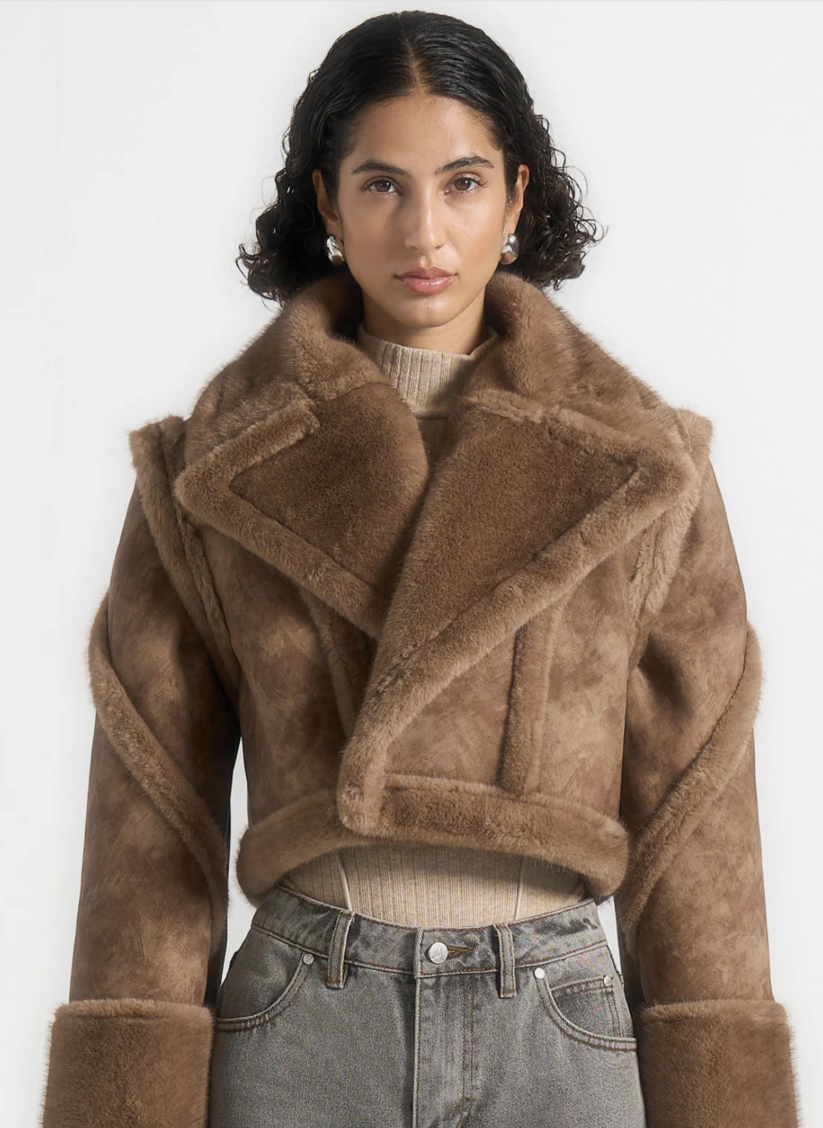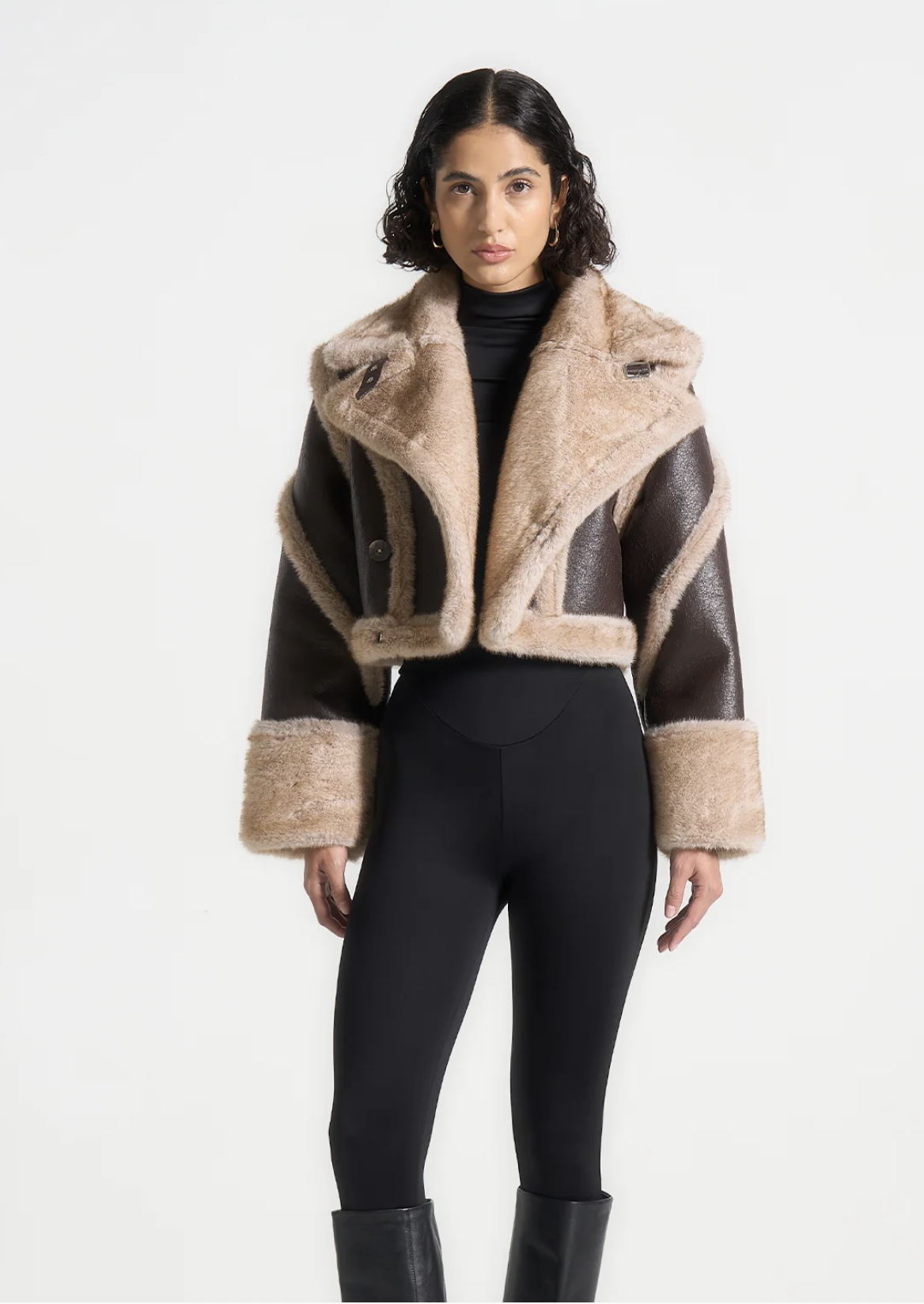 The contrasting faux fur collar and hem introduce a bold focal point, enhanced by deep plush cuffs that add softness and warmth. Contour plush detailing accentuates the body’s natural shape, bringing depth and dimension to the silhouette, while classic lapels infuse a tailored sensibility that balances edge with refinement.