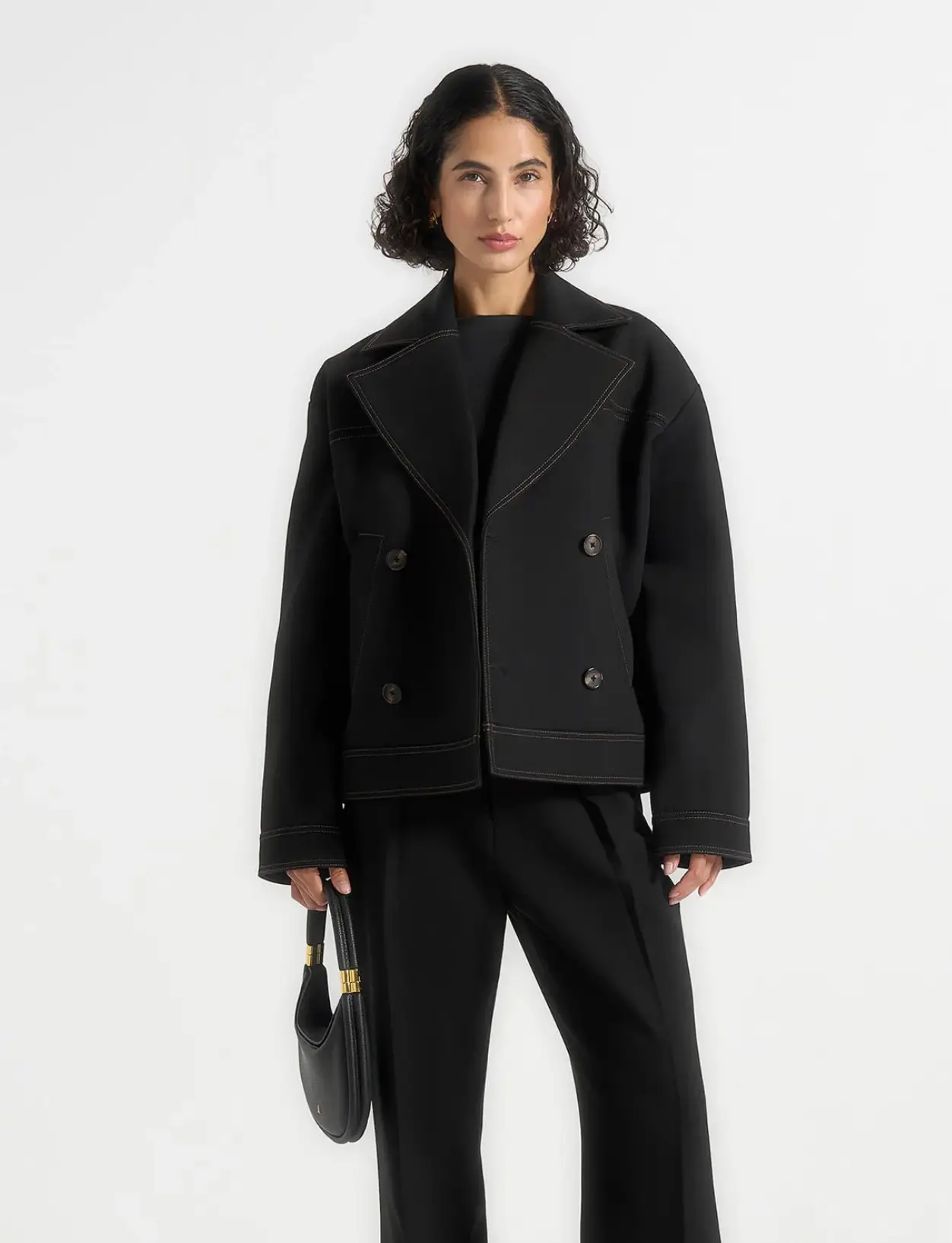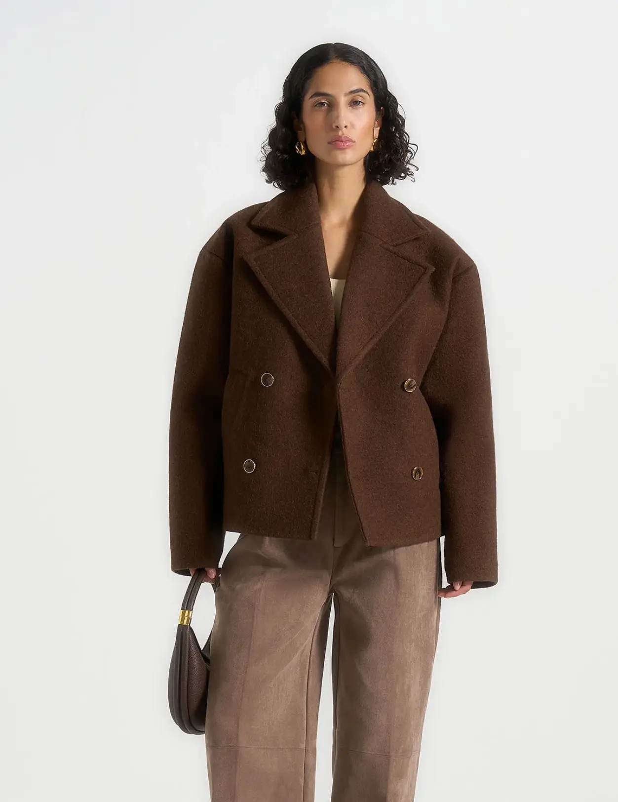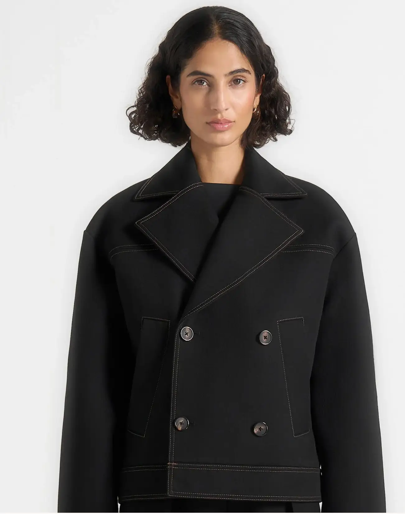 The double-breasted silhouette evokes traditional sartorial craftsmanship while remaining distinctly contemporary. Marble feature buttons add a refined, statement accent that enhances the coat’s structured aesthetic. Thoughtfully designed angular, wool-lined front pockets combine functionality with comfort, while the smooth satin lining ensures a polished interior feel and effortless layering.
