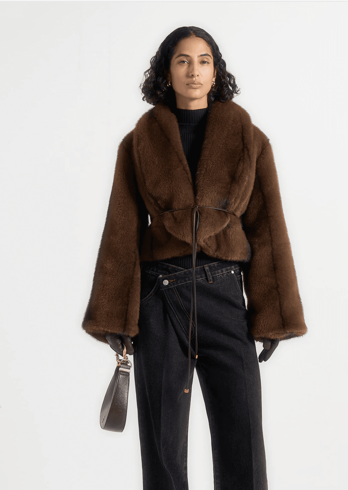 The Nola in Brown – Fur Shawl Jacket with Leather Belt combines warmth and refinement. Crafted from soft faux fur with concealed hooks and a detachable leather belt, it offers versatile styling and a sleek silhouette. Finished with a tonal Manière De Voir vegan leather patch.